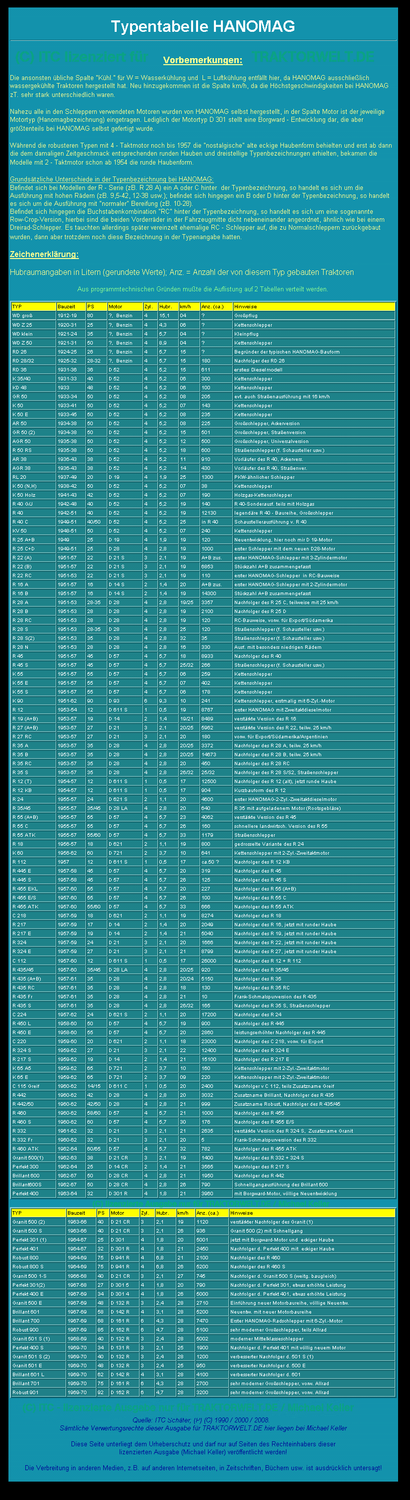 HANOMAG - Typentabelle (nur Schlepper), ITC - Schäfer - Liste / alle Rechte hier dieser Ausgabe bei Michael Keller.