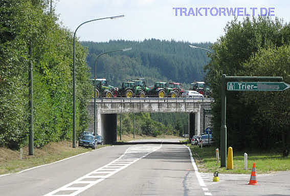 Eine Traktor - Tour der besonderen Art, die sogar über eine Autobahn führte, konnte ich 11. September 2009 im Grenzgebiet zwischen Belgien / Luxemburg und Deutschland fotografieren. Im Rahmen einer “Milchpreis - Protestaktion” führte diese Tour zahlreiche Landwirte mit ihren Schleppern auf die Autobahn A 60 zwischen dem belgischen St. Vith und dem deutschen Winterspelt bei Prüm, wo die Autobahn dann im Bereich der Grenze mit Schleppern “dicht” gemacht wurde. Das Foto entstand auf belgischer Seite von der Landstraße Lommersweiler (Belgien) - Steinebrück - Urb / Winterspelt (Deutschland), wo diese unter der abgebildeten Brücke in der Nähe von Lommersweiler die mit  Traktoren zugeparkte A 60 unterquert.